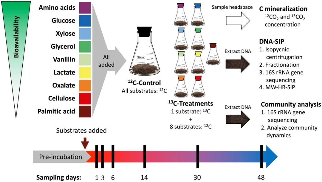 作者采用了多底物、DNA 稳定同位素探测实验示踪不同生物可利用度、不同来源碳的细菌同化过程。这种方法使我们能够通过测量不同微生物相互作用的碳同化动力学来测量微生物对 SOM的贡献。作者鉴定了 1,286 个细菌类群,它们在 48 天的时间里同化了农业土壤中的 13C。细菌类群的整体 13C 同化动力学受13C的来源和时间影响,表现出低系统发育保守性。因此确定了由具有相似 13C 同化动力学的分类群组成结构。碳源生物利用度解释了碳矿化动态和群落结构的显著变化,并且细菌生长动态因碳添加而显著不同。微生物结构解释了大陆和全球范围内细菌生物地理分布的变化。因此,可见,了解原位生长动态对于了解微生物对土壤碳循环的贡献至关重要。