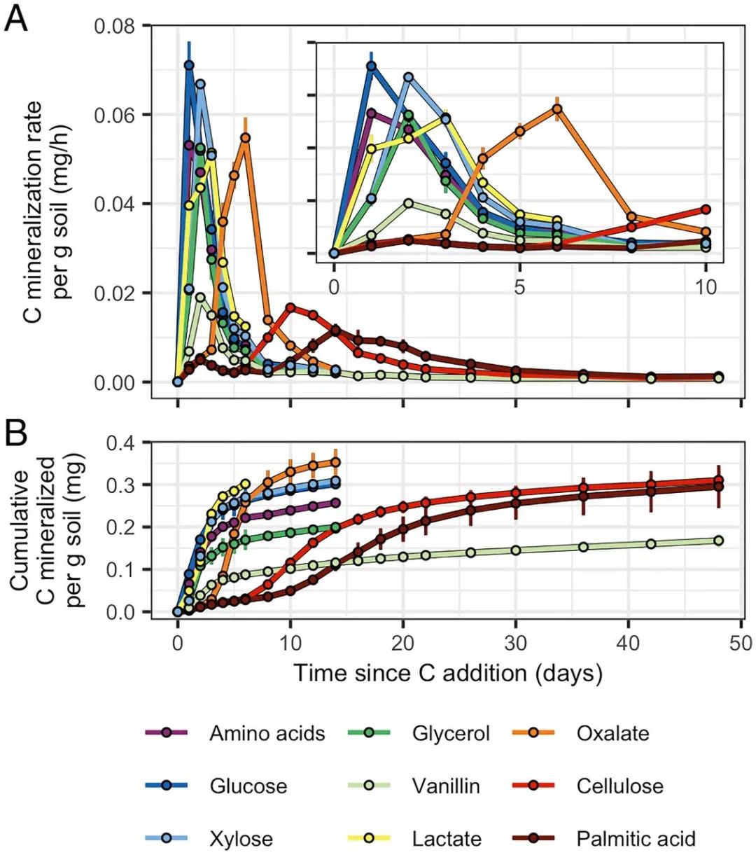 C source mineralization dynamics varied based on bioavailability. (A) 13C mineralization rates and (B) cumulative amounts of 13C mineralized per gram dry weight of soil. (A, Inset) A finer-scale representation of the 13C mineralization rates over days 0 to 10. Error bars represent ± SD among microcosm replicates (n = 3).