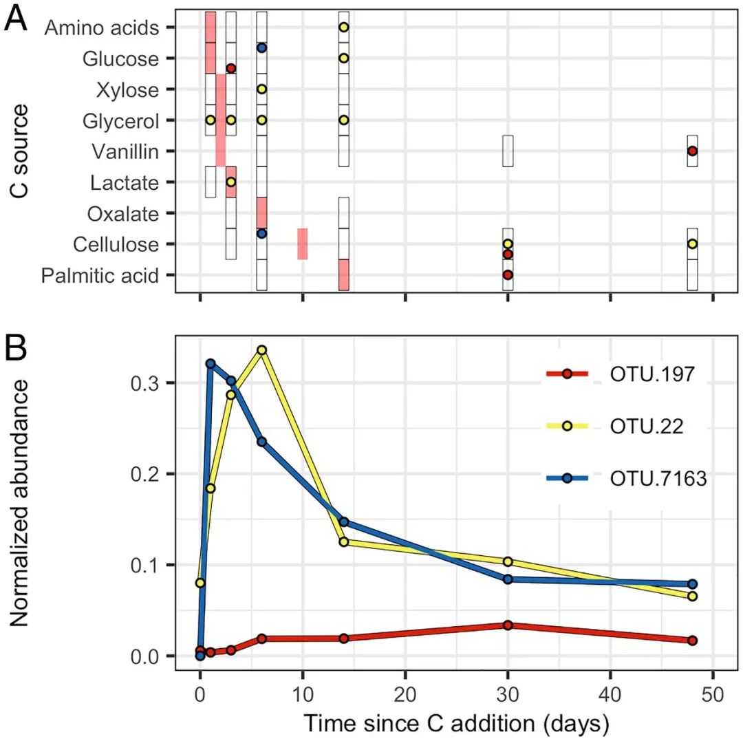 Growth and 13C-labeling dynamics of the most abundant OTUs representing guilds 2 (OTU.197), 14 (OTU.22), and 19 (OTU.7163), which are the guilds most differentiated by PCA (Fig. 5E). (A) The 13C-labeling pattern differs between the three exemplar OTUs. Circles show times when 13C labeling was detected for each substrate and OTU responses are identified by circle color as defined in B. Black rectangles indicate the times when DNA-SIP was performed for each 13C-labeled substrate and red rectangles indicate the time of peak C mineralization for each C source (Fig. 2). (B) Growth dynamics differ between the three exemplar OTUs. Normalized abundance (expressed as micrograms of DNA) is calculated from relative abundance values normalized by rrn copy number and DNA yield.