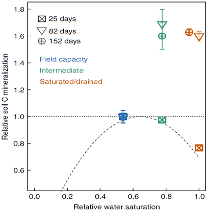 Fig. 2 Relationships between soil moisture and cumulative C mineralization.Values of soil C mineralization from our study were normalized by the values at field capacity measured at 25, 82, and 152 days, respectively.Soil moisture for the saturated/drained period at 152 days is the mean value overthis experiment. The dashed line is the best-fit relationship from Moyano etal.5: SRH = 3.11θS−2.42θS2,in which SRH is soil C mineralization and θS is relativewater saturation. Each point is the averaged value across the three Mollisols.The error bars indicate s.e.m. (n = 12)