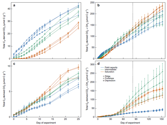 研究选取长期进行玉米(C4)与大豆(C3)轮作土壤进行培养实验,玉米(C4)与大豆(C3)轮作可以为实验提供了自然稳定同位素(δ13C)标记。同时考虑到地形特点,选择坡顶(ridge),坡面(footslope)及坡底(depression)进行采样。研究区域即使有人工排水系统,但土壤含水量和水位也经常出现较大的季节性波动,因此培养实验设置三种水分环境(田间持水量的51%、77%、99%)。通过152天的恒温培养实验来研究土壤水分含量变化对土壤CO2和CH4产生及其δ13C值的影响。