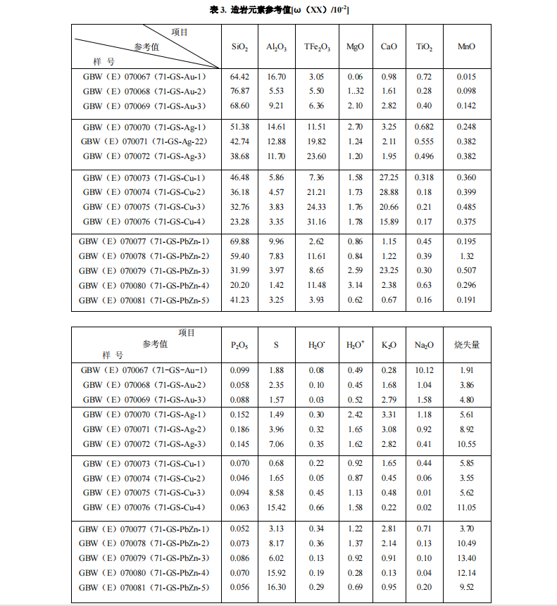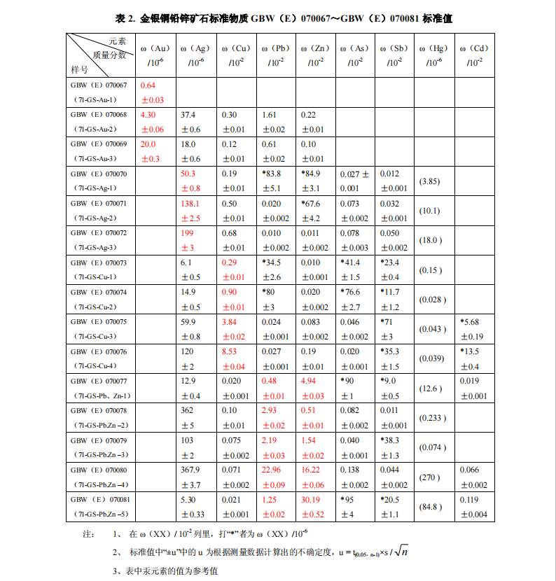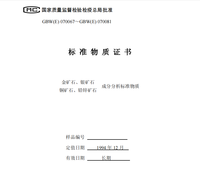 GBW(E) 070067~GBW(E) 070081金矿石、银矿石、铜矿石、铅锌矿石成分分析标准物质清单