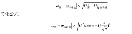 如果实验室对标准物质的测量值超出了标准物质特性量值的不确定度范围,是不能直接 得出测量结果存在偏差的结论的,原因是标准物质的不确定度 U 标准物质仅包括了与标准物质定 值、均匀性、稳定性有关的不确定度,没有涉及用户在实验室里对标准物质进行测量有关的 随机不确定度 U 测。因此,应采取以下通用公式判断标准物质测量值与标准值之间存在显著偏差: