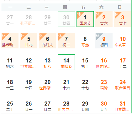 根据国庆放假通知,并结合本公司实际情况,经研究决定,公司决定2021年十一国庆节放假安排如下: 2021年10月1日至10月7日放假,共7天。10月9日(星期六)正常上班。 放假前,请同事们要认真做好安全隐患排查工作,注意防火、防盗等。放假期间请注意假期安全,最后祝大家祥和平安度过国庆节假期。由于特殊时期,非必要不离郑,注意防护。祝大家国庆节快乐!